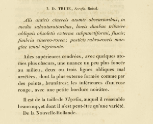 - Original description: Boisduval (1832): Voyage de découvertes de l'Astrolabe Exécuté par ordre du Roi, pendant les années 1826-1827-1828-1829, sous le commandement de M. J. Dumont d'Urville. Faune Entomologique de l'océan pacifique, avec l'illustration des insectes nouveaux recueillis pendant le voyage. Première partie. Lépidoptères: I-IV, 5-267, pl. 1-12. Paris (J. Tastu).