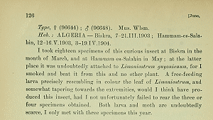 Bidzilya et al. (2021) melden: "The host-plants are Limonium pruinosum (L.) Chaz. (“Statice pruinosa”) (CHRÉTIEN, 1915: 330) and, probably, Limoniastrum guyonianum Durieu ex Boiss. (Plumbaginaceae) (WALSINGHAM, 1905: 126; CHRÉTIEN, 1917: 480)."