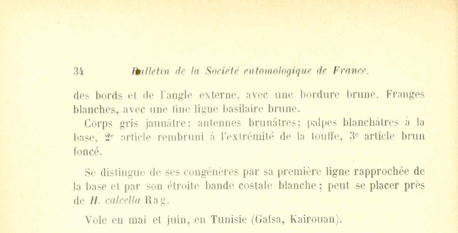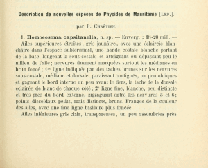 - Erstbeschreibung: Chrétien, P. (1911): Description de nouvelles espèces de Phycides de Mauritanie (Lep.). — Bulletin de la Société entomologique de France 1911 (1): 33-36.