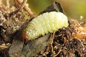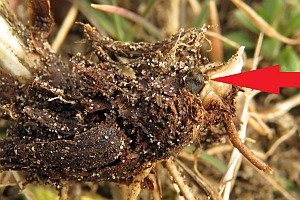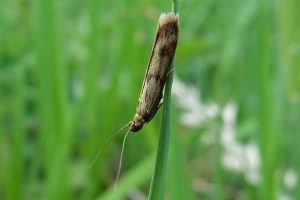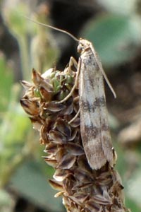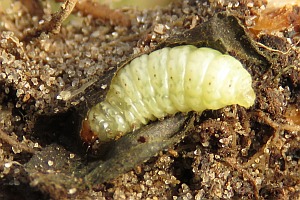 1: Belgien, Nieuwpoort, Spitzwegerich (Plantago lanceolata) mit Raupe im Wurzelstock, 24. März 2018 (Foto Ruben Meert)