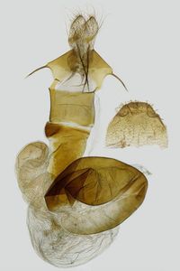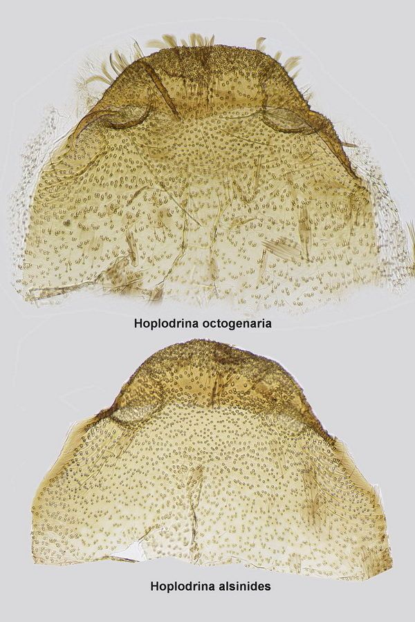 Das subbasale ventrale Divertikel in der Vesica ist bei den ♂♂ von H. alsinides länglich-subkonisch und schmaler als bei H. octogenaria und mit drei deutlich getrennten Gruppen von stacheligen Cornuti versehen (Huemer et al. 2020).
