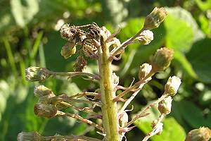 1-2: frühes Befallsbild an Pestwurz (Petasites hybridus) - Befall ist an einer leicht angewelkten Blütentriebspitze erkennbar (in Bild 2 zum Fotografieren geöffnet): Deutschland, Thüringen, Gönnatal nördlich Jena, 21. April 2007 (Freilandfotos: Egbert Friedrich)Forum