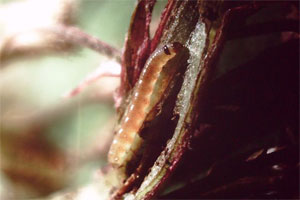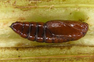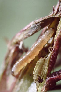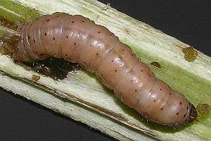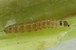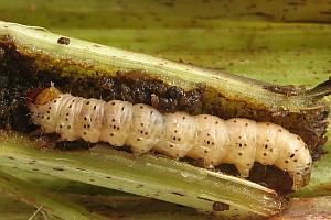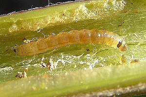 4-5: Jungraupe im Blütenstiel von Petasites hybridus (Pestwurz): Deutschland, Niedersachsen, Landkreis Helmstedt, Wassergraben, zwischen den Ortschaften Lehre und Groß Brunsrode, 80 m, 5. Mai 2013 (manipulierte Freilandaufnahmen: Wolfgang Rozicki)Forum