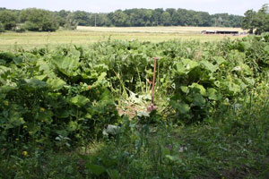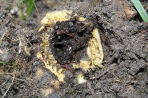 5: Fraßgang mit Genagsel im Wurzelbereich von Petasites hybridus (Pestwurz): Deutschland, Niedersachsen, Landkreis Helmstedt, Wassergraben, zwischen den Ortschaften Lehre und Groß Brunsrode, 80 m, 30. Juni 2013 (manipulierte Freilandaufnahme: Wolfgang Rozicki)Forum