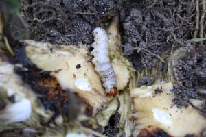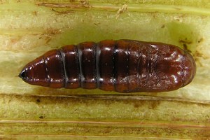 3: ausgegrabene, erwachsene Raupe im Wurzelbereich von Petasites hybridus (Pestwurz): Deutschland, Niedersachsen, Landkreis Helmstedt, Wassergraben, zwischen den Ortschaften Lehre und Groß Brunsrode, 80 m, 30. Juni 2013 (Foto: Wolfgang Rozicki)Forum