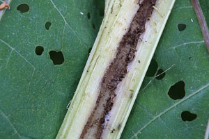 4: Fraßgang im Blattstiel von Petasites hybridus (Pestwurz): Deutschland, Niedersachsen, Landkreis Helmstedt, Wassergraben, zwischen den Ortschaften Lehre und Groß Brunsrode, 80 m, 30. Juni 2013 (manipulierte Freilandaufnahme: Wolfgang Rozicki)Forum