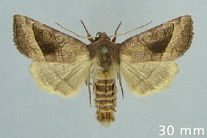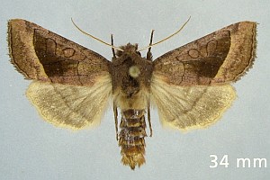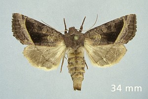 Falter: Auf den Vorderflügeln ist meist ein dunkler Schatten im unteren Mittelfeld vorhanden. Die innere Querlinie verläuft meist rundbogig. Die Wellenlinie mündet deutlich von der Verlängerung der äußeren Querlinie abgesetzt auf den Vorderrand. Auf den Hinterflügeln kein oder nur ein undeutlich ausgebildeter Mittelfleck. Hinterflügelgrundfarbe relativ dunkel, bräunlich. Im Durchschnitt die kleinste der drei Arten. (Text: Axel Steiner)