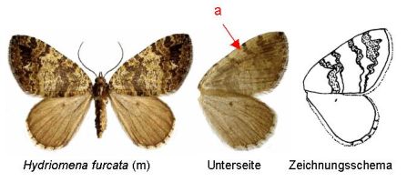 weicht trotz ihrer großen Variabilität von den beiden anderen (Hydriomena ruberata und Hydriomena impluviata) so erheblich in der Zeichnungsanlage ab, dass auch bei Dunkelformen Verwechselungen kaum möglich sind. Wichtigstes Unterscheidungsmerkmal sind die dunklen Ansätze der Querlinien am Vorderrand des Vorderflügels, die man auf der Unterseite besonders deutlich sieht (a).