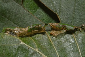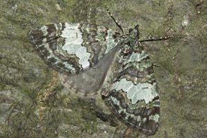 besitzt in den hellen Zeichnungselementen graugrüne Schuppen (Lupe). Die äußere Begrenzung des Mittelfeldes verläuft in Bögen am Mittelpunkt vorbei (b).