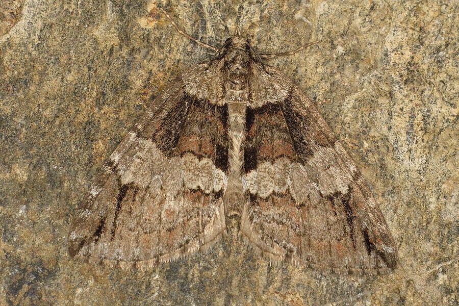 hat in der Regel eine etwas gestrecktere Flügelform als die beiden anderen Arten. Auch dunkle Tiere weisen eine deutliche rote Beschuppung auf (Lupe). Die äußere Begrenzung des Mittelfeldes verläuft etwas winkeliger als bei Hydriomena impluviata, was man besonders auf der Flügelunterseite erkennen kann (c). Der Apikalwisch (d) ist sehr deutlich ausgeprägt. Bei Hydriomena impluviata ist er sehr kurz, bei Hydriomena furcata fehlt er.