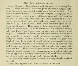- Original description: Lower, O. B. (1903): Descriptions of New Australian Noctuina, &c. — Transactions and Proceedings and Report of the Royal Society of South Australia 27 (1): 27-74. Adelaide (W. C. Ribgy).