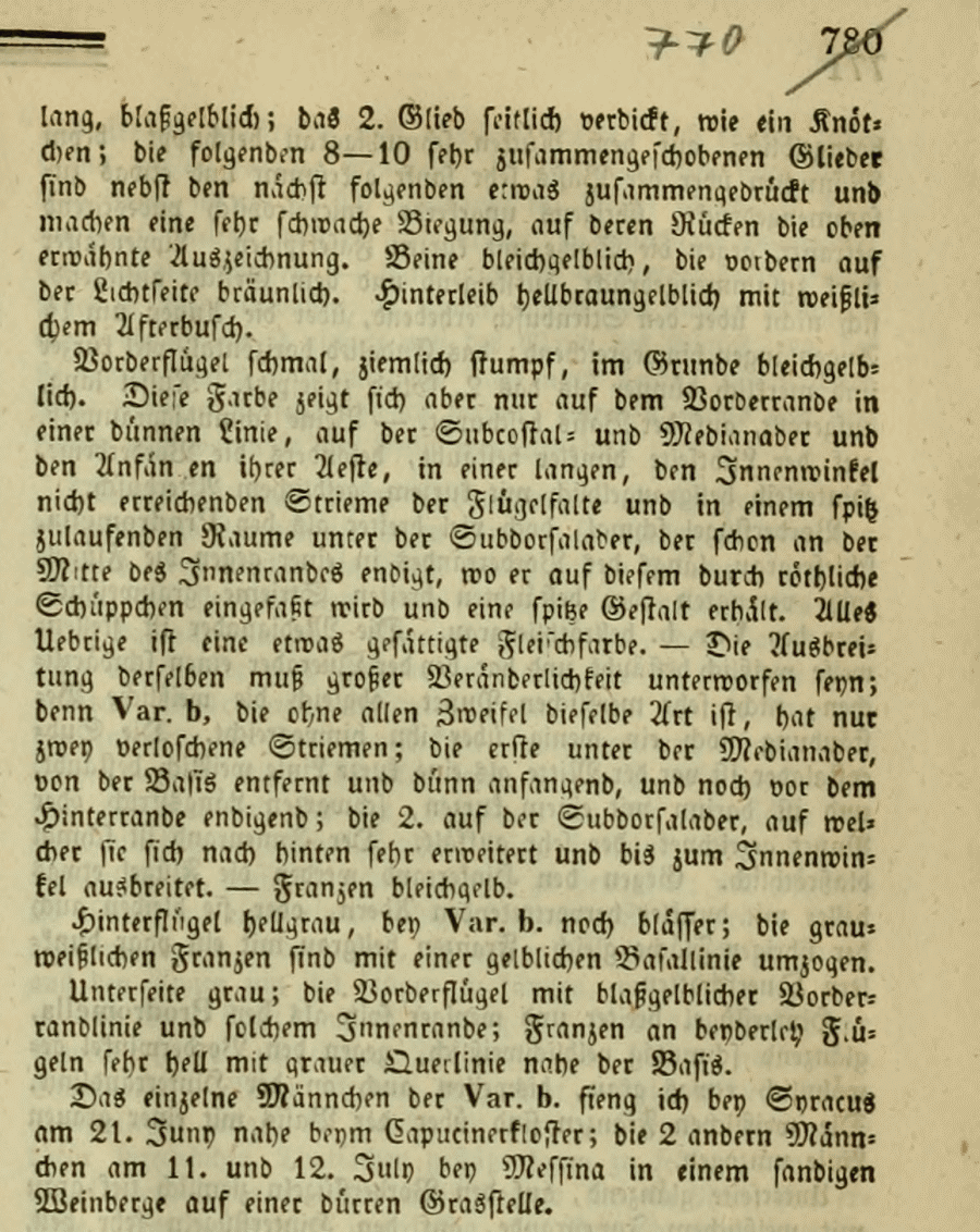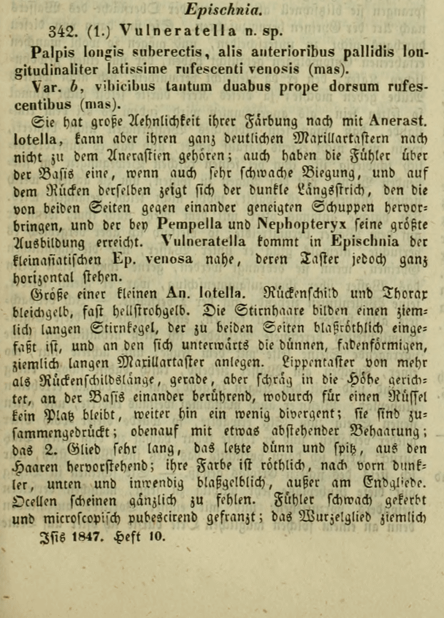 - Erstbeschreibung: Zeller, P. C. (1847): Bemerkungen über die auf einer Reise nach Italien und Sicilien beobachteten Schmetterlingsarten. — Isis von Oken 1847 (2): 121-159, (3) 213-233, (4) 284-308, (6) 401-457, (7) 481-522, (8) 561-594, (9) 641-673, (10) 721-771 [770 falsch als "780" columniert], (11) 801-859, (12) 881-914.