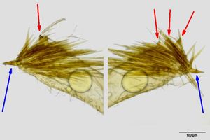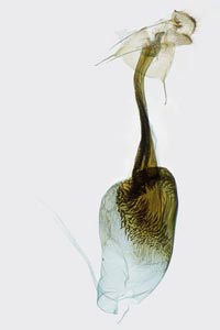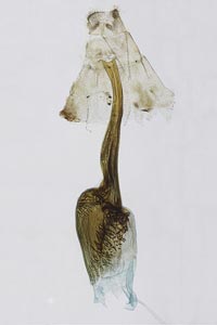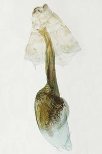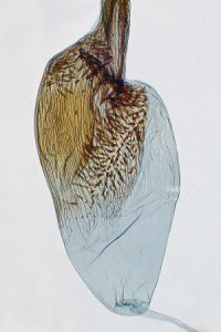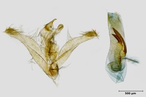 1-2: Genitalpräparat des als Diagnosebild 3 abgebildeten ♀, Deutschland, Baden-Württemberg, 78176 Blumberg, Ortsrandlage, Südhang, in Waldnähe (Buchen-Mischwald, Waldrand mit anschließendem Trespen-Halbtrockenrasen auf Kalk), 720 m, am Licht, 11. Juli 2014 (leg., gen. det., Präparation & Foto: Hans-Peter Deuring), [2] Corpus bursaeForum