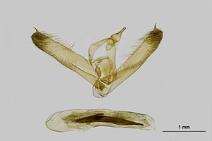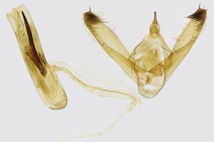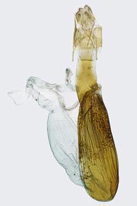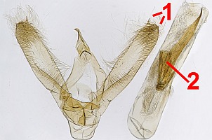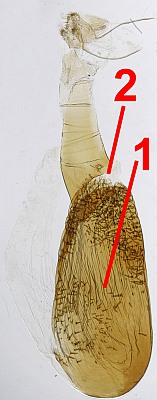 1: Genitalpräparat des unter Lebendfalter 1 abgebildeten ♂, Österreich, Niederösterreich, Bad Fischau, 3. Juli 2004(Präparation & Mikro-Foto: Peter Buchner)