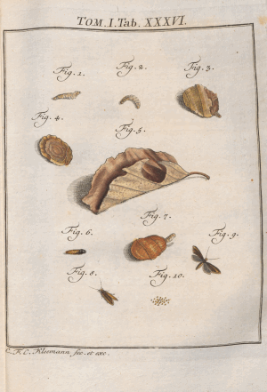 - Kleemann, C. F. C. [1761]-[1776]: Beyträge zur Natur- oder Insecten-Geschichte. Bestehend in Vier und vierzig nach der Natur gezeichneten und mit Farben erleuchteten Kupfertafeln sammt deren Erklärung: 1-376, pl. I-XLIV.