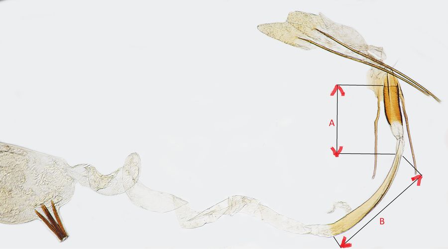 1: ♀, Deutschland, Sachsen, Umgebung Nochten, Ruderalstandort in Rekultivierung, 128 m, 2. Juni 2016 am Licht, (leg., gen. det. & fot.: Friedmar Graf)Forum 2-3: ♀, Deutschland, Sachsen, Umgebung Lohsa, extensives Grünland, 125 m, 25. Juni 1989 Tagfang (leg., gen. det. & fot.: Friedmar Graf)Forum 4-5: ♀, Slowakei, Nitriansky kraj, Pohronská pahorkatina, Hronské Kľačany, Garten, 165 m, 6. Juli 2002 (leg., prep., gen.det. & Foto: František Kosorín), conf. J. NelForum Wichtige Merkmale bei der Bestimmung sind die Länge des Antrums und des transparenten Teils des Ductus bursae (A), die immer kleiner als der sklerotisierte Teil des Ductus bursae (B) ist. Bei Isophrictis celsei ist die Länge von A und B beinahe identisch (Hinweis von František Kosorín).