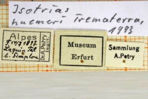 • Erstbeschreibung: Trematerra, P. (1993): Isotrias huemeri sp. n. (Lepidoptera Tortricidae) from southern Appennine. — Bollettino di Zoologia agraria e di Bachicoltura, serie II 25 (1): 11-17.