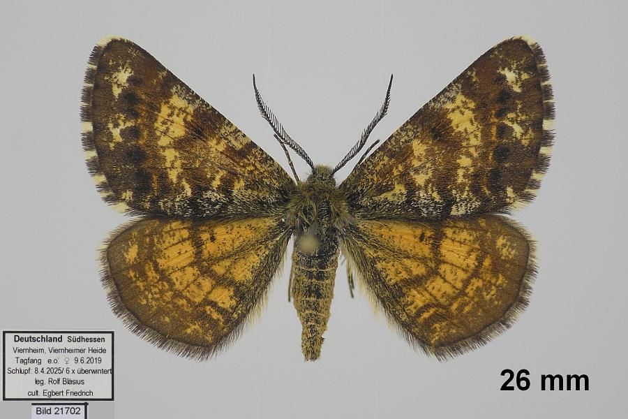 12-13: ♂, Deutschland, Hessen, Viernheim, Viernheimer Heide, 100 m, e.o. Zucht, ♀ leg. & det. Rolf Bläsius am 9. Juni 2019, Tagfang, Falterschlupf nach sechsmaliger Überwinterung 8. April 2025 (cult. & fot.: Egbert Friedrich)Forum