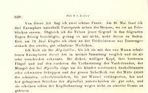Zeller (1868) berichtete in seiner Erstbeschreibung: "Von dieser Art fing ich zwei schöne Paare. Am 26. Mai fand ich drei Exemplare unterhalb Unterpreth neben der Strasse, wo sie an Felsblöcken sassen. Obgleich ich die Felsen jener Gegend in den folgenden Tagen fleissig besichtigte, gelang es mir nicht, mehr davon zu finden. Erst am 12. Juni klopfte ich oben an der Predielstrasse aus Tannengesträuch das zweite, gut erhaltene Weibchen." Diese 4 Exemplare waren also alle als Syntypen aufzufassen.