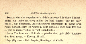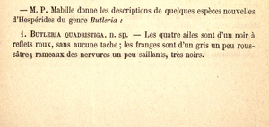 - Erstbeschreibung: Mabille, P. (1889): Descriptions de quelques espèces nouvelles d'Hespérides du genre Butleria. — Bulletin des séances et bulletin bibliographique de la Société entomologique de France 5: XCI-XCIII. — Digitalisat auf biodiversitylibrary.org: [XCI]