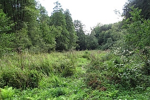 3: enges Bachtal mit einem stark verwachsenen Teich ("Woog") mit Bachlauf und Galium palustre auf Schwingböden wachsend: Deutschland, Rheinland-Pfalz, Pfälzer Wald, Weidenthal, Leinbachtal, 260 m, 9. Mai 2010 (Foto: Michael Ochse)