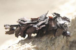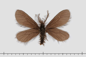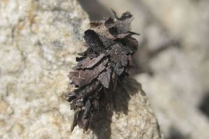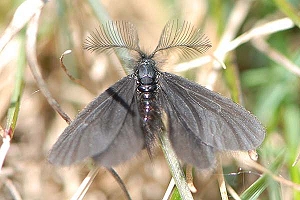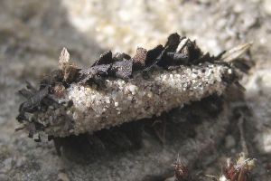 Der Raupensack besteht bei dieser Art aus einer inneren Hülle aus Sandkörnchen und einer äusseren, nur auf der Rückenseite ausgebildeten Hülle, bestehend aus lose angesponnenen Pflanzenteilen. [Rudolf Bryner]