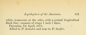 - Erstbeschreibung: Butler, A. G. (1877): On the Lepidoptera of the Amazons, collected by James W. H. Trail, Esq., during the years 1873 to 1875. — The Transactions of the Entomological Society of London for the Year 1877 (2): 105-156, pl. III. — Digitalisat auf biodiversitylibrary.org: [152]