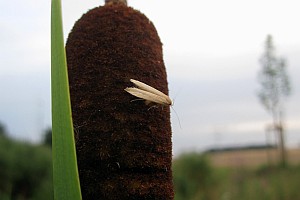12: Deutschland, Niedersachsen, Umgebung Rodenberg, Streuobstwiese in Gewässernähe, 70 m, an Rohrkolben (Typha latifolia) sitzend, 13. Juli 2014, Abendfund (Freilandfoto: Tina Schulz)Forum