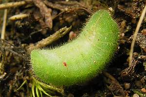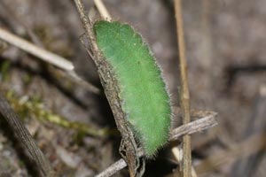 8: Raupe verlässt im Morgengrauen die Nahrungspflanze Rumex acetosella: Frankreich, Elsass, Hagenauer Forst, Waldlückensysteme auf Sandboden, 146 m, 2. Juni 2019 (det. durch Zucht & Freilandfoto: Michael Levin)Forum