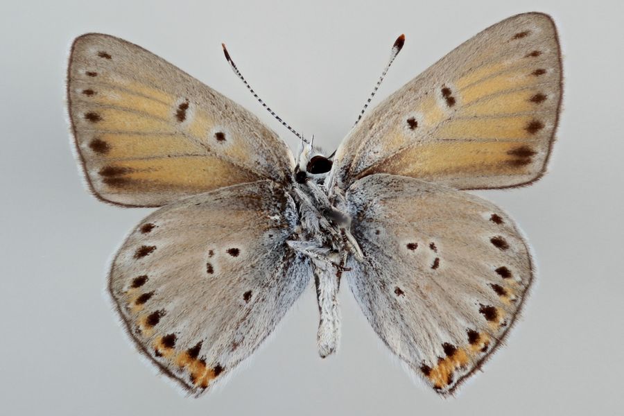 Bei Lycaena hippothoe hat man zumindest immer noch den Eindruck, daß die Punkte eine recht harmonische Linie bilden, während diese bei Lycaena alciphron doch deutlich ungeordneter daherkommt...