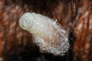4: Puppenkokon (mit noch unverpuppter Raupe darin), Daten wie Bild 1-3 (manipuliertes Freilandfoto am 30. März 2007: Heidrun Melzer)