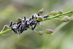 8-9: Eiraupen, ohne konkrete Daten, Steppenvegetation in einem Flugsandgebiet, Fund des Eigeleges 4. Mai 2018, frisch geschlüpfte Raupen, Länge 5,5 mm, 15. Mai 2018 (Foto: Karl-Heinz Lauterbach), det. Daniel Bartsch & Miroslav MilenkovicForum