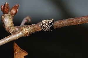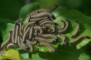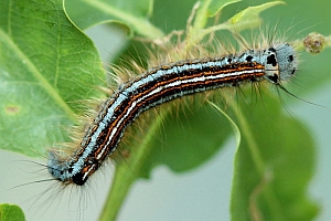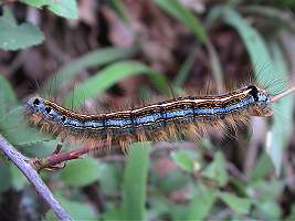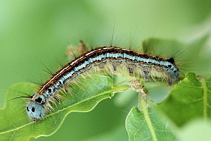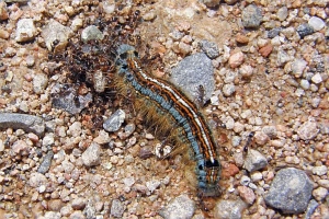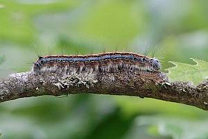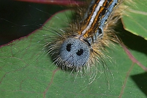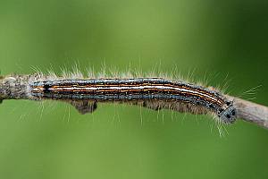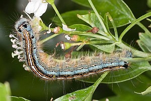 Die Altraupen von Malacosoma neustria unterscheiden sich von anderen Arten der Gattung durch die zwei dunklen Punkte auf dem Kopf.