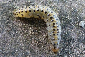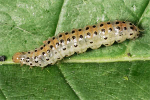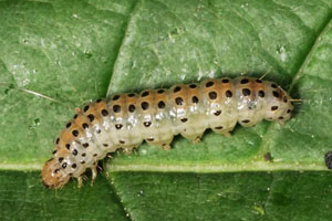 Eine oben gezeigte Raupe wurde von M. Stemmer bei Unkel (Rheinland-Pfalz) in einem trockenwarmen Weinbergshang "unter einem Stein an Labkraut" gefunden und im weiteren Verlauf auch mit Labkraut bis zum Falter durchgezüchtet. Im hessischen Mittelrheingebiet (Lorchhausen, Rüdesheim) wurden fressende Raupen in ziemlicher Anzahl an Galium mollugo-Pflanzen geleuchtet, die in Weinbergsmauern wuchsen, und mit dieser Pflanze zum Falter gezüchtet (siehe obiges Raupenfoto H. Falkenhahn). Slamka (2013: 98) hingegen behauptet: "The larva lives 8-5 in a silken tube amongst the leaves of Helianthemum spp.", also der Pflanze, die auch Mecyna trinalis ernährt.