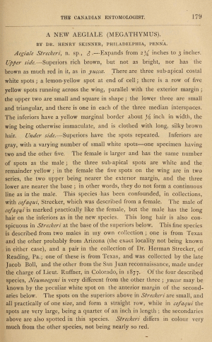 - Erstbeschreibung: Skinner, H. (1895): A new Aegiale (Megathymus). — The Canadian Entomologist 27: 179. [Digitalisat auf biodiversitylibrary.org]
