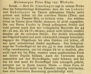 Rajaei & al. (2023: 2023) verneinen ein Vorkommen im Iran: “Records of M. titea wiskotti from “Persien” by Seitz (1909) and Gaede (1931c) are erroneous. This species does not occur in Iran.”