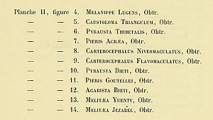 - Erstbeschreibung: Oberthür, C. (1886): Espèces nouvelles de lepidoptères du Thibet. — Études d'entomologie 11: [V]-XII, 13-38, pl. I-VII.