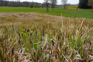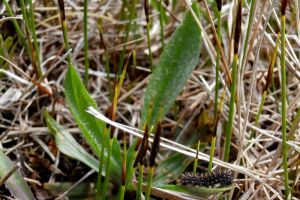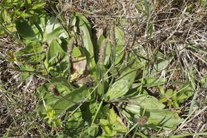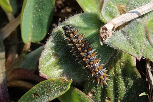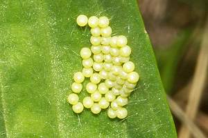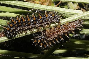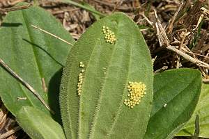 Das ♀ legt die Eier in Gelegen an die Blattunterseite von Spitzwegerich (Plantago lanceolata) und Mittlerem Wegerich [(Plantago media) im Schaffhauser Randen sicher nachgewiesen]. Während die 1. Gen. gut anfliegbare Pflanzen an lichten Stellen in der Wiese bevorzugt, belegen die ♀ ♀ der 2. Gen. vorzugsweise Pflanzen zuvor gemähter Wiesen. Bei kühler Witterung und in kälteren Habitaten werden vorzugsweise Pflanzen belegt, die am Waldrand wachsen.