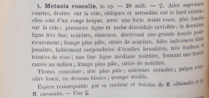 Zu Metasia rubricalis ist in der Erstbeschreibung von Rebel (1939) zu lesen: "Ein ♂ mit der Bezeichnung "Agios Joanni, 28. Juli '30. Mavromoustakis" aus der Sammlung des Naturhistorischen Museum Wien, zeigt eine so auffallende, dichte ziegelrote Bestäubung der Vfl., dass es nicht als Aberration zu der auch beträchtlich kleiner bleibenden M. rosealis Rag. gehören kann. Die Fühler scheinen stärker, die Labialpalpen länger zu sein. Die Vfl. sind dicht ziegelrot bestäubt und zeigen nur die kaum erkennbaren Spuren des in Punkte aufgelösten äußeren Querstreifens und eine Spur der dunklen Mittelmakel. Die gelbgrauen Hfl. sind vor dem Saum stark rötlichgrau verdunkelt. Die Unterseite der Vfl. dunkelgrau bestäubt, jene der Hfl. weißgrau, am Vorderrand dunkler bestäubt mit deutlichem schwärzlichem Mittelpunkt. Bei rosealis bleibt auch die Unterseite viel lichter. Vfl 10, Exp. 19 mm (bei rosealis 8:16)."