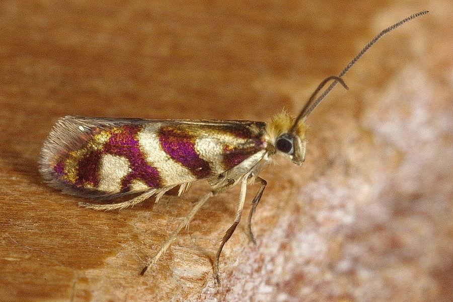 6: Österreich, Oberösterreich, Frankenburg, 19. Mai 2012, Tagfund (fot.: Thomas Rupp), det. Thomas GuggemoosForum 7: Schweiz, St.Gallen, Wattwil, 750 m, 30. April 2012, Tagfund (det. & fot.: Pia Rindlisbacher), conf. Daniel BoltForum 8: Deutschland, Baden-Württemberg, Feldberg im Schwarzwald, ca. 1200 m, 18. Mai 2012, Tagfund (fot.: Michael Becker), det. Annette von Scholley-PfabForum 9: Österreich, Steiermark, St. Kathrein/Offenegg, Sommeralm, Forstweg, 1400 m, 21. Mai 2016, Tagfund (det. & fot.: Horst Pichler), conf. Christof ZellerForum 10: ♀, Österreich, Steiermark, Graz, St. Peter, ca. 450 m, Lustbühel, Mischwald, 8. Mai 2018 (Foto: Horst Pichler), det. Horst Pichler, Uwe Büchner & Jürgen Quack, conf. Christof ZellerForum 11: ♂, Österreich, Steiermark, Ponigl bei Weiz, Mähwiese in Forstgebiet, in der Abenddämmerung gefangen, ca. 850 m, 2. Mai 2019 (det., präp. & Foto: Horst Pichler)Forum 12: ♀, Österreich, Steiermark, Ponigl bei Weiz, sonniger Forstweg, ca. 800 m, Tagfang, 24. Mai 2019 (gen.det. & Foto: Horst Pichler)Forum 13: ♂, Österreich, Steiermark, Präbichl, Reichenstein, Bergwiese, 1400 m, 26. Mai 2025, Tagfund (Foto: Horst Pichler)Forum 14: ♀, Österreich, Steiermark, Präbichl, Reichenstein, Bergwiese, 1400 m, 6. Juni 2025, Tagfund (Foto: Horst Pichler)Forum 1-2: Schweiz, Kanton Bern, Hasliberg, 1050 m, Buchen-/Mischwald, 18. Mai 2013 (fot.: Hildegard Stalder), det. Christof ZellerForum 1: ♂, Schweiz, Bern, Biel-Bözingen, 540 m, 30. April 2000 (Aufnahme: Rudolf Bryner), leg., praep. & det. Rudolf BrynerForum 1: ♀, Schweiz, Neuchâtel, Le Landeron, 740 m, Flaumeichenwald, 22. Mai 1991 (Aufnahme: Rudolf Bryner), leg., praep. & det. Rudolf BrynerForum Mattgoldener Dorsalstreifen vorhanden und dadurch basales Querband nur zur Costa hin leuchtend golden; mittleres Querband gewinkelt, zur Costa hin breiter werdend, beide Flügelränder erreichend; Apikal- und Costalfleck sowie gold-glänzende Schuppen am Flügelsaum vorhanden. Ähnliche Arten: