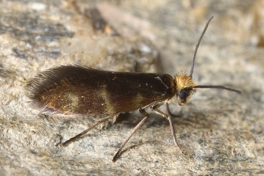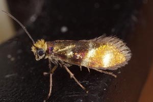 - Micropterix schaefferi (Flügelsaum mit goldschillernden Schuppen, Costalfleck vorhanden)
