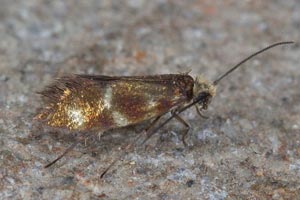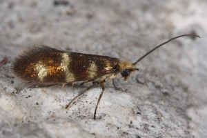 - Micropterix osthelderi (Flügelsaum mit goldschillernden Schuppen, Costalfleck vorhanden)
