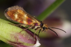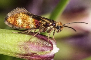 - Micropterix aglaella (basales Querband vollständig matt golden)