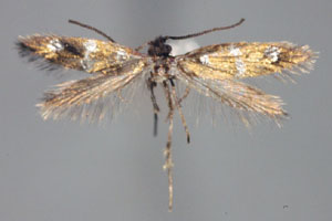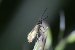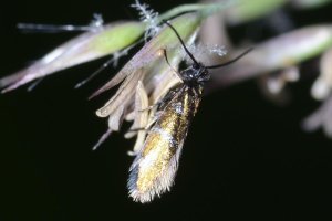 Man beachte die schwarze Kopfbeschuppung! Es ist äußerst schwer, im Gelände die ebenfalls sehr kleinen Tiere von Micropterix aruncella zu unterscheiden: Die Weibchen von M. fenestrellensis sind ebenfalls gezeichnet, und die Grundfärbung der Vorderflügel ist golden statt bronze-kupfrig wie bei M. aruncella [Christof Zeller].