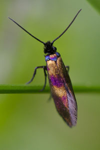 Vorderflügel purpurrot mit matt goldener Zeichnung, die im äusseren Drittel fehlt; Kopf schwarz. Ähnliche Art: