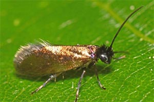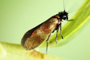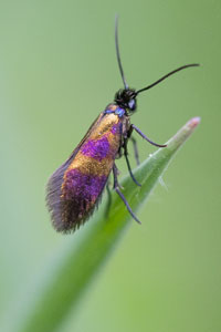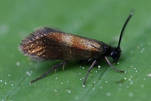 - Micropterix tunbergella (die matt goldene Zeichnung erstreckt sich über den ganzen Vorderflügel; Kopf gelb)