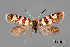 Querbänder leuchtend golden, vom Vorderrand bis zum Hinterrand reichend; Subapikalfleck dreieckig, oft mit Costalfleck verbunden und an der Costa einen kleinen Fleck in der Färbung der Grundfarbe bildend; gold-glänzende Beschuppung am Flügelsaum vorhanden, mattgoldener Dorsalstreifen fehlt. Ähnliche Arten: