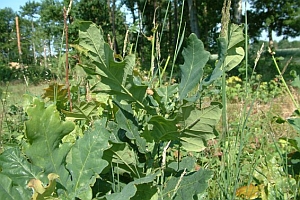 1: kleine Eichenbüsche und Stockausschläge mit frischen Trieben (Johannistrieb), Deutschland, Brandenburg, Fläming, Umgebung Jeserig, 18. Juni 2008 (Foto: Stefan Ratering). „Geht man etwas näher an den Eichenbusch heran, sieht man schon eine halberwachsene Raupe von Minucia lunaris auf der Blattunterseite sitzen“ (Bildmitte rechts).Forum