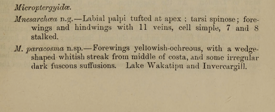 - Erstbeschreibung: Meyrick, E. (1885): Descriptions of New Zealand Microlepidoptera. Gelechiadae VIII. Tineina (part). — New Zealand Journal of Science, 2: 589-592. [Digitalisat auf biodiversitylibrary.org]