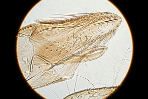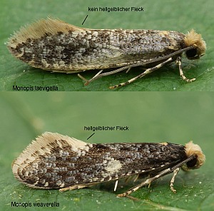 M. weaverella mit hellgelblichem Fleck am Innenwinkel der Vorderflügel am Beginn der Fransen, der bei M. laevigella fehlt.